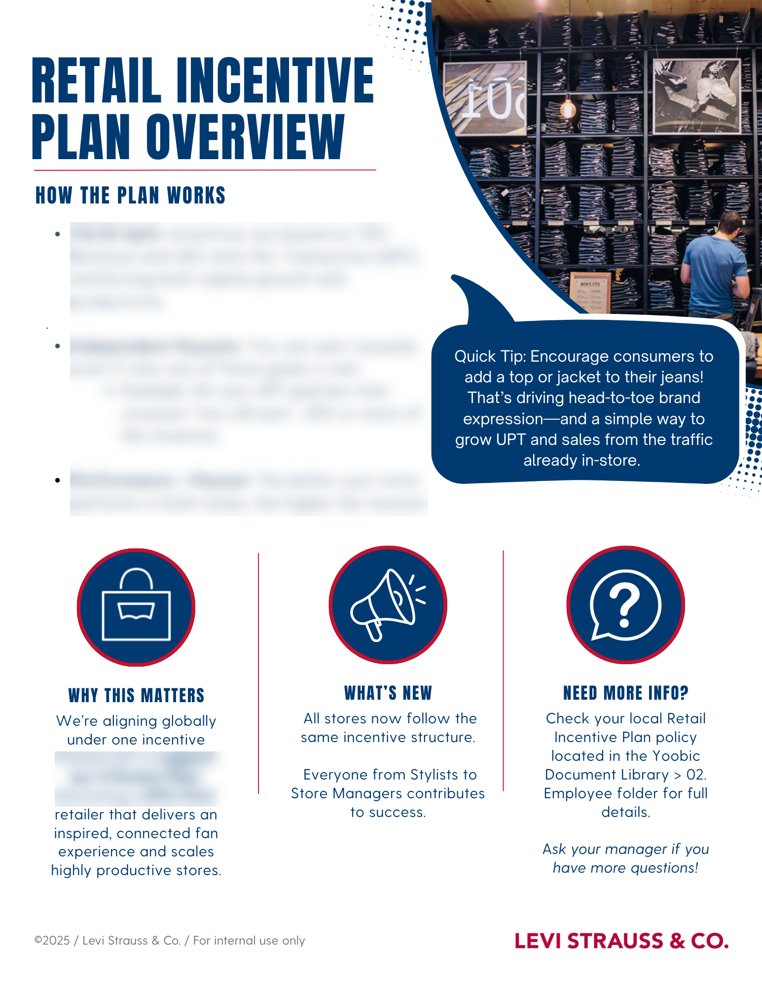 This guide was designed to clearly communicate a new global retail incentive plan, helping store teams understand how selling behaviors directly impact performance and payouts. By connecting metrics like Revenue and Units Per Transaction (UPT) to practical selling tips, the asset reinforced Selling Model behaviors and supported consistent execution across stores.